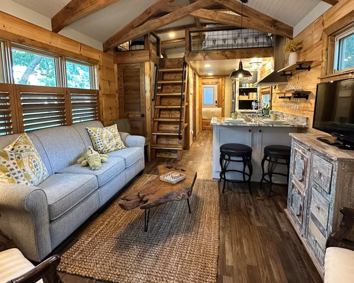 warm wood finishes, a comfortable living room with queen sleeper sofa, fully equipped kitchen, additional sleeping loft, full modern bath; plus-every accessory for a unique restful stay.